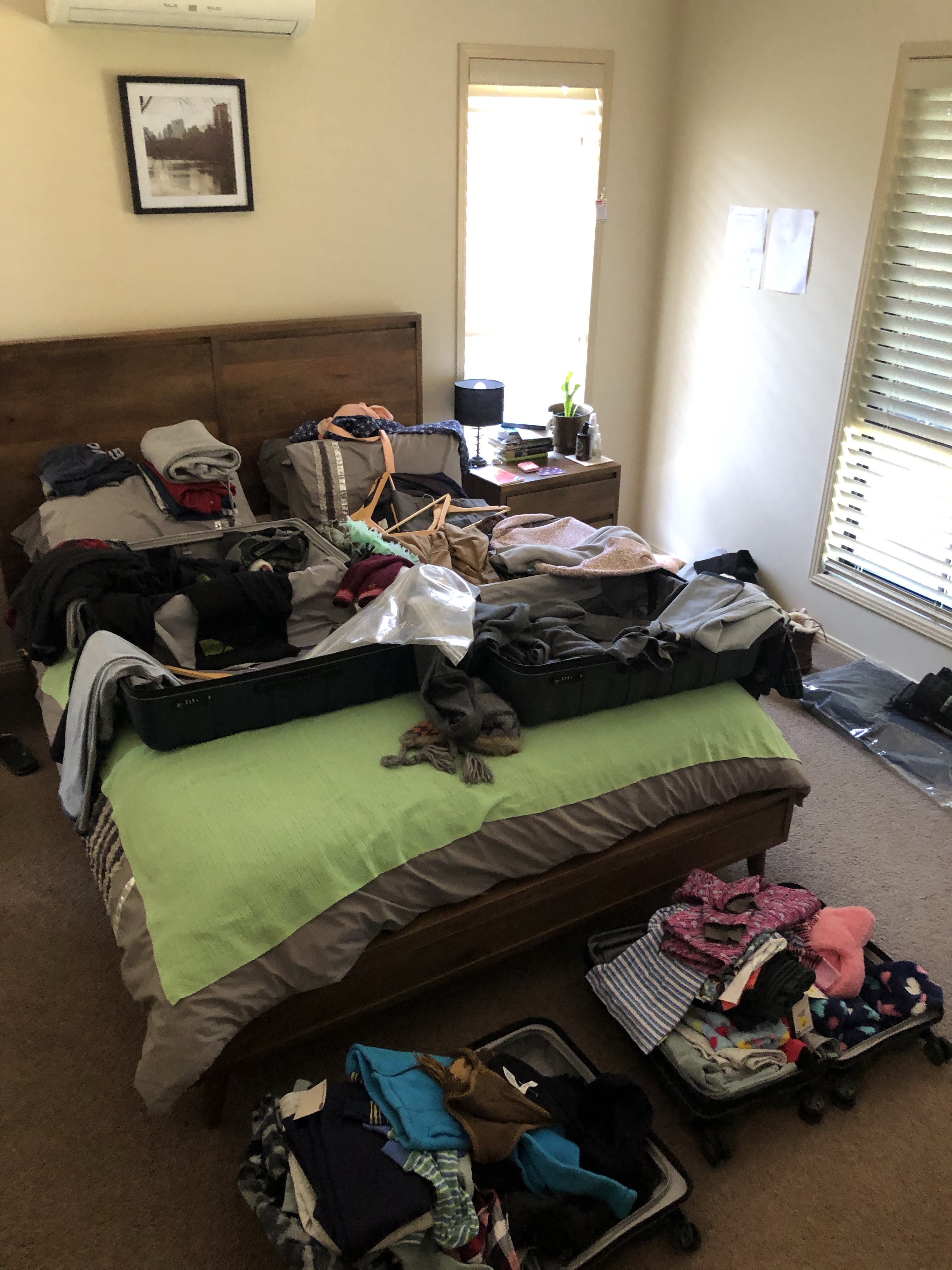 Our bedroom looked like our walk-in robe threw up for about 4 hours but in the end we had it sorted. We had upgraded our suitcases earlier in the year taking advantage of a Strandbag sale and purchased 2 large and 2 cabin sized hard cased Antler Juno luggage. 376L of combined capacity seems plenty but traveling in winter requires so many bulky layers that they quickly filled. At home I’ll wear the same clothes every day for a week but packing for a holiday I seem to pack like I’m going to change my clothes 3 times a day so pack EVERYTHING! Not this time. I had to be ruthless and only take the necessities. The biggest challenge we faced was making sure our larger bags were going to be under the 23kg weight limit. The problem with 2 large bags and 2 smalls is that is difficult to distribute weight evenly. We had to abandon the idea of having 4 suitcases packed for each individual person instead putting all the heaviest items in the small cases like our shoes and toiletries and mixing the kids clothes in with ours.