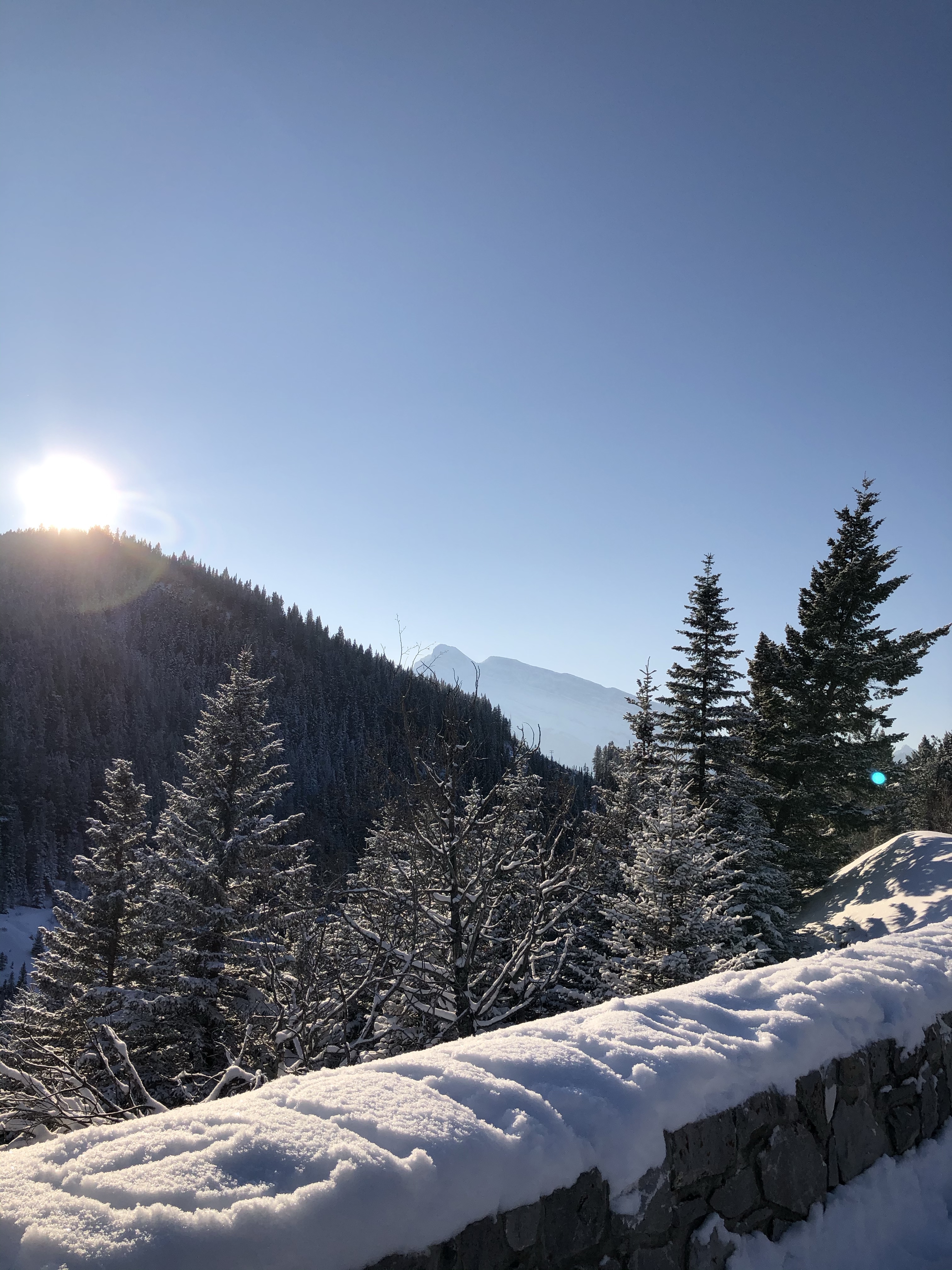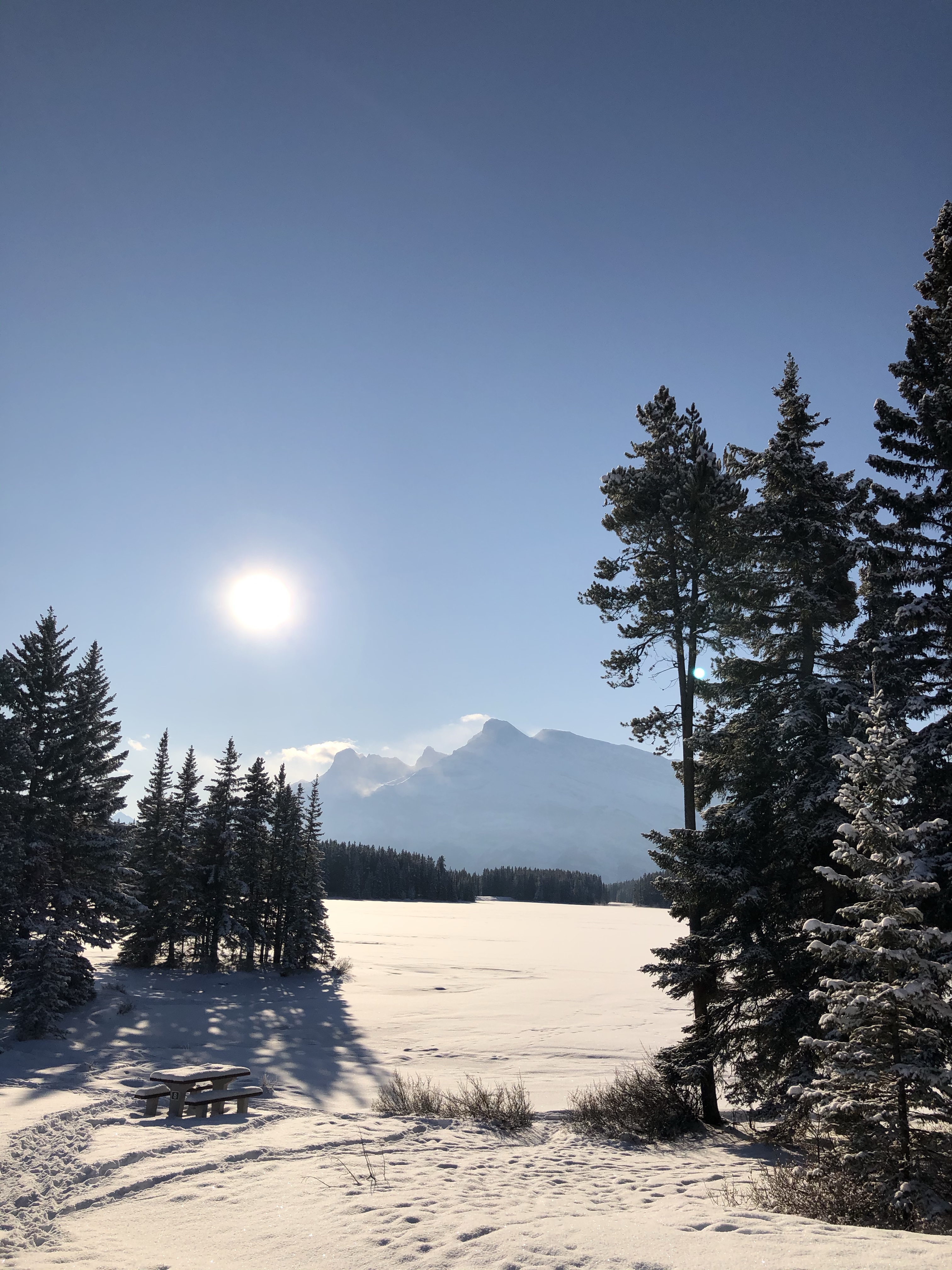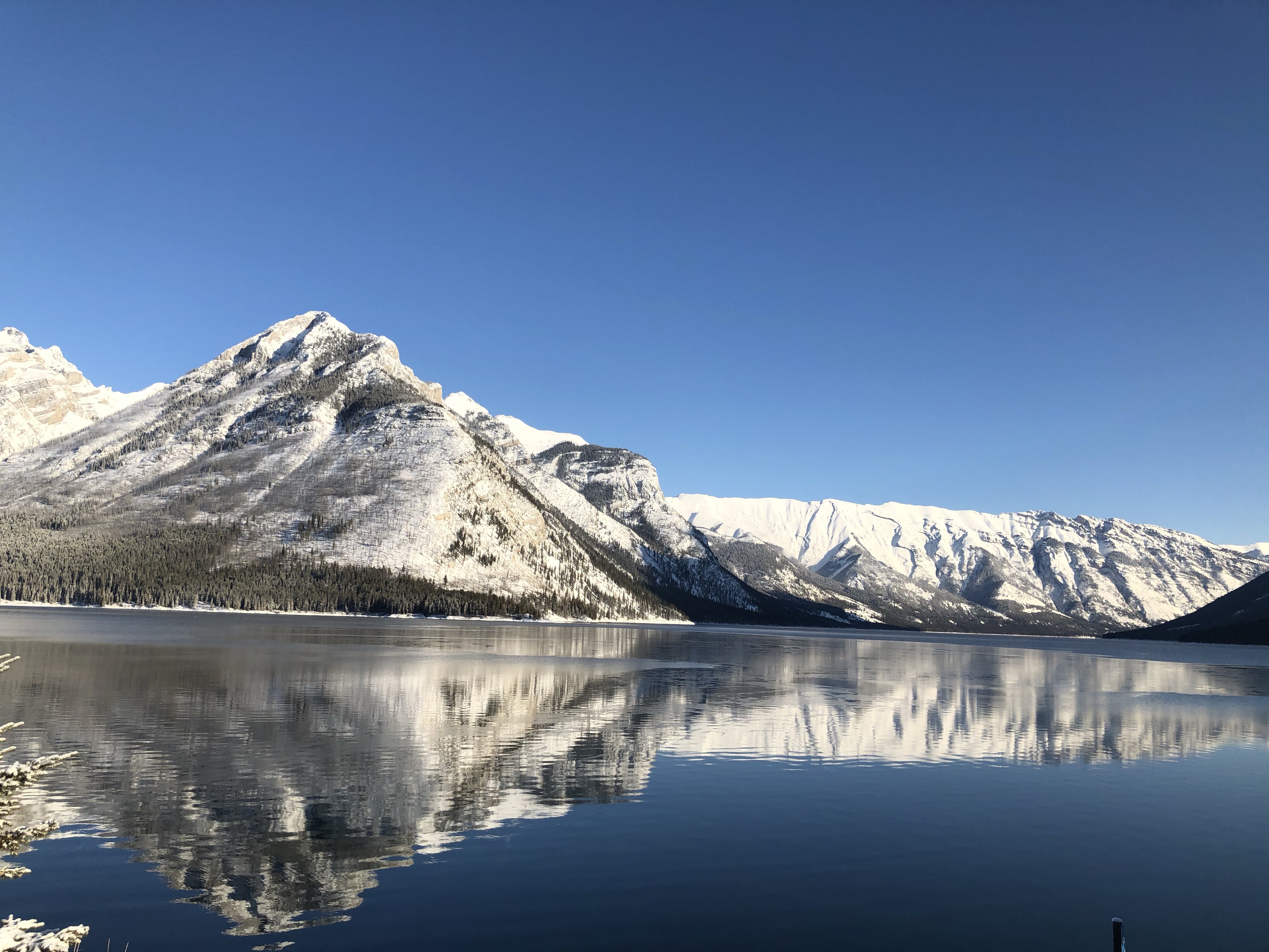 The weather on our last day in Banff (and also our 7th Wedding Anniversary) was clear and beautiful after overnight snow so we took a drive out to Lake Minnewanka and it didn’t disappoint. It’s so difficult to get true photos of the landscape here as the images never do the real thing justice. The downside to visiting Banff National Park during winter is a lot of roads are closed for the season. Many are open for cross country skiiing, snowshoeing and hiking, activities a little too adventurous for us with the kids and no experience so we just stuck to the sites we could access via vehicle.