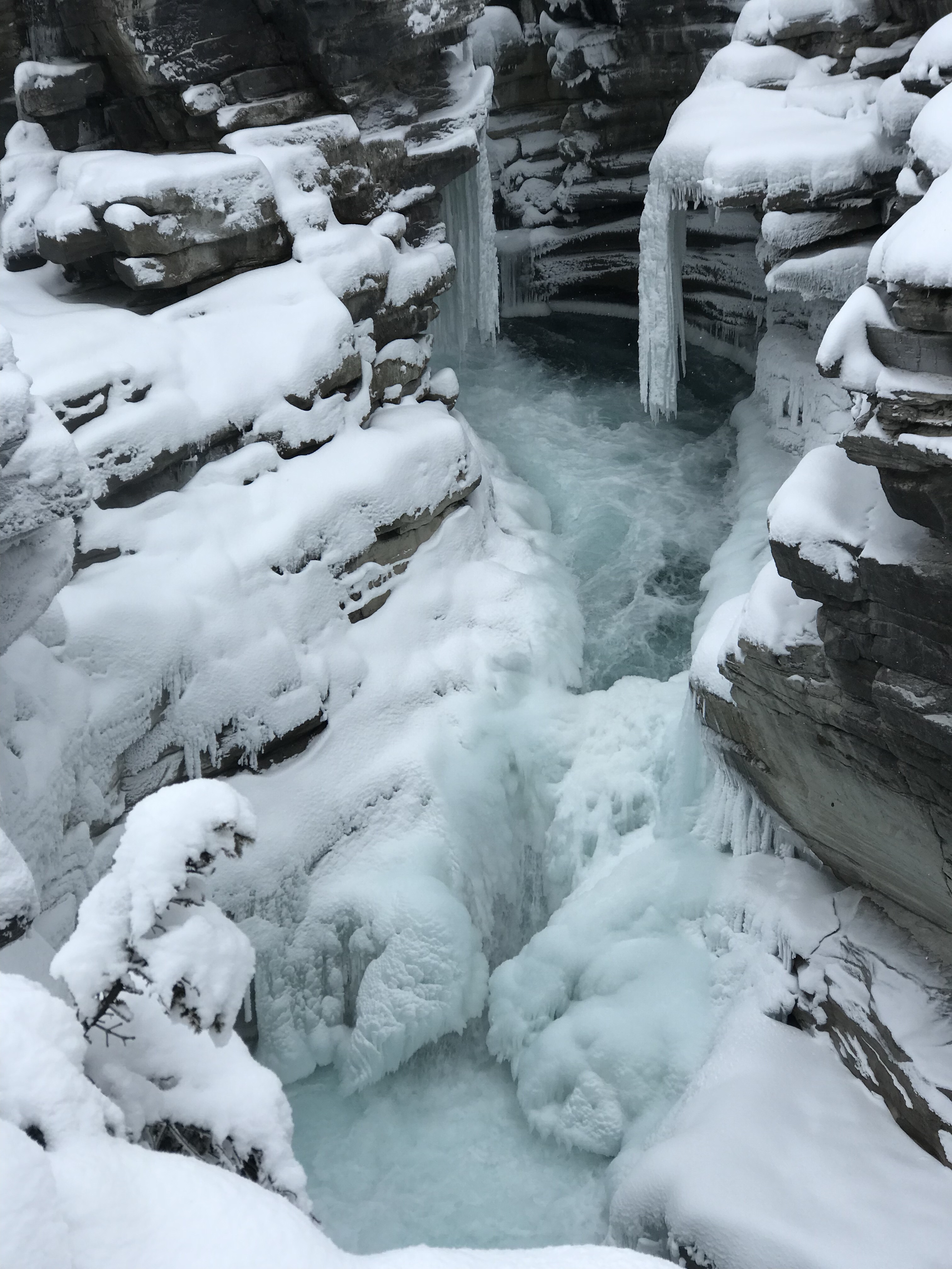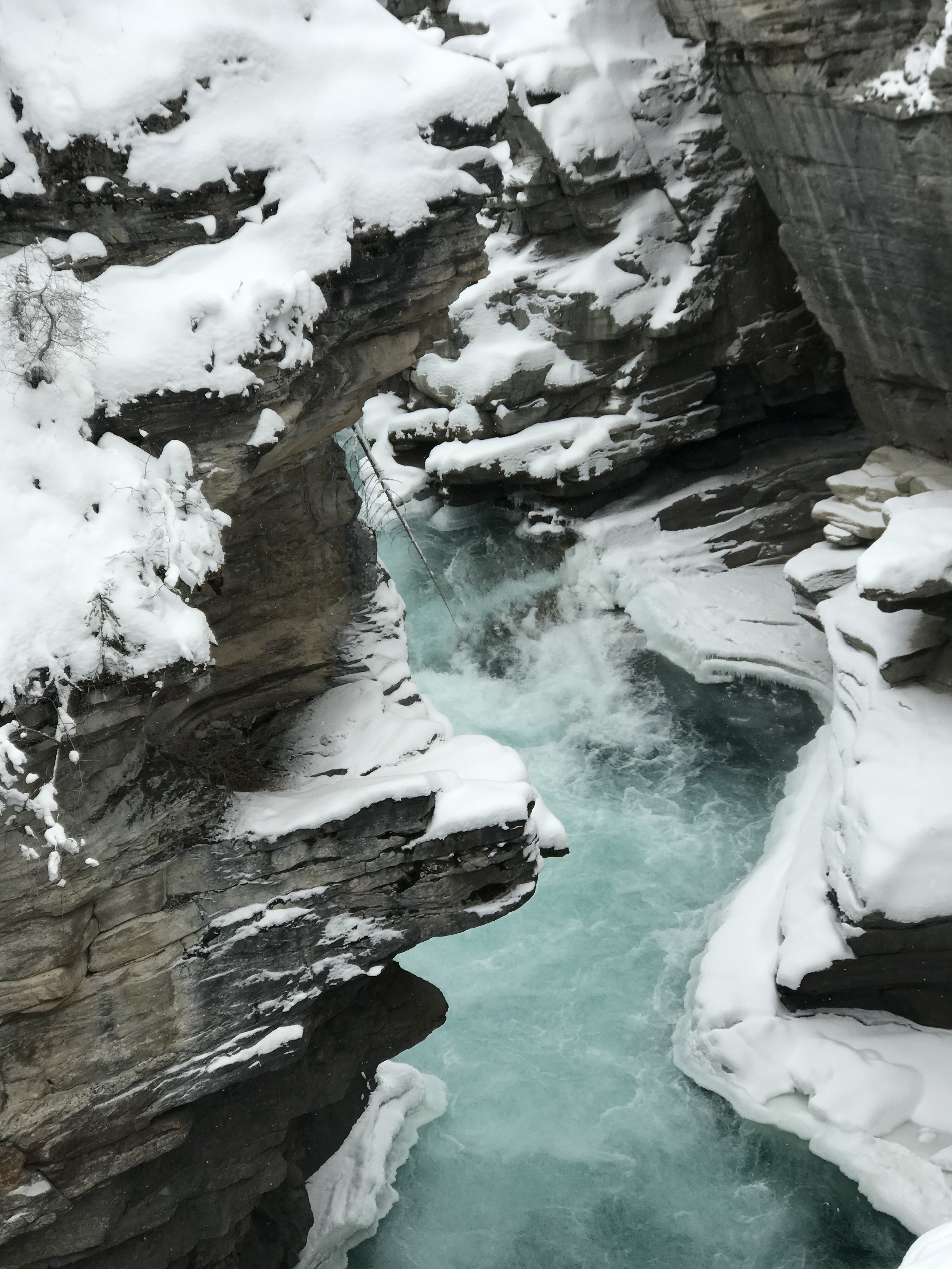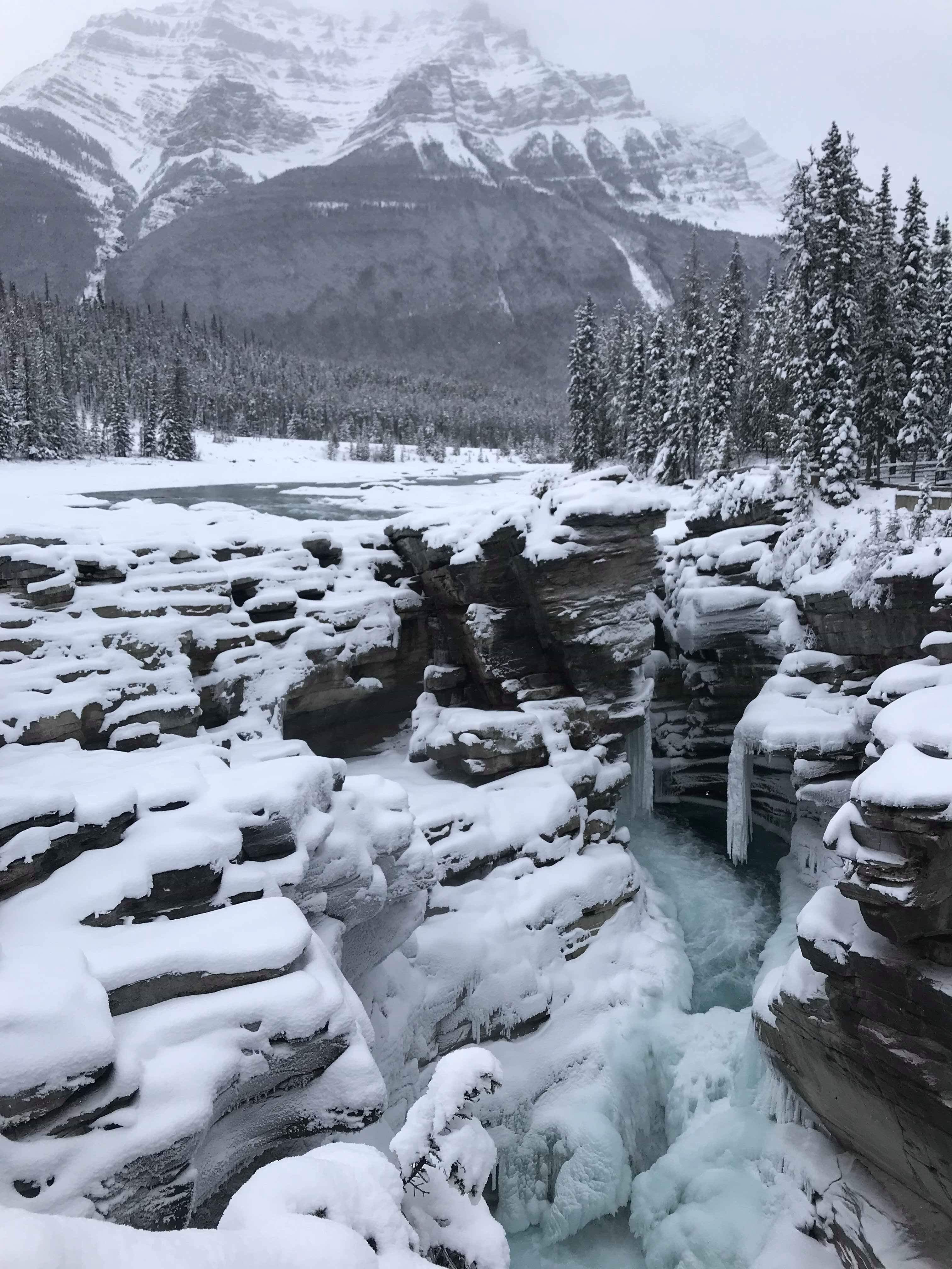 We stopped at Athabasca Falls about 30km from Jasper and quickly changed everyone into their ski pants. The snow was quite deep but the trudge in was well worth it. The turquoise icy water thundering over the falls was a sight and sound to behold.