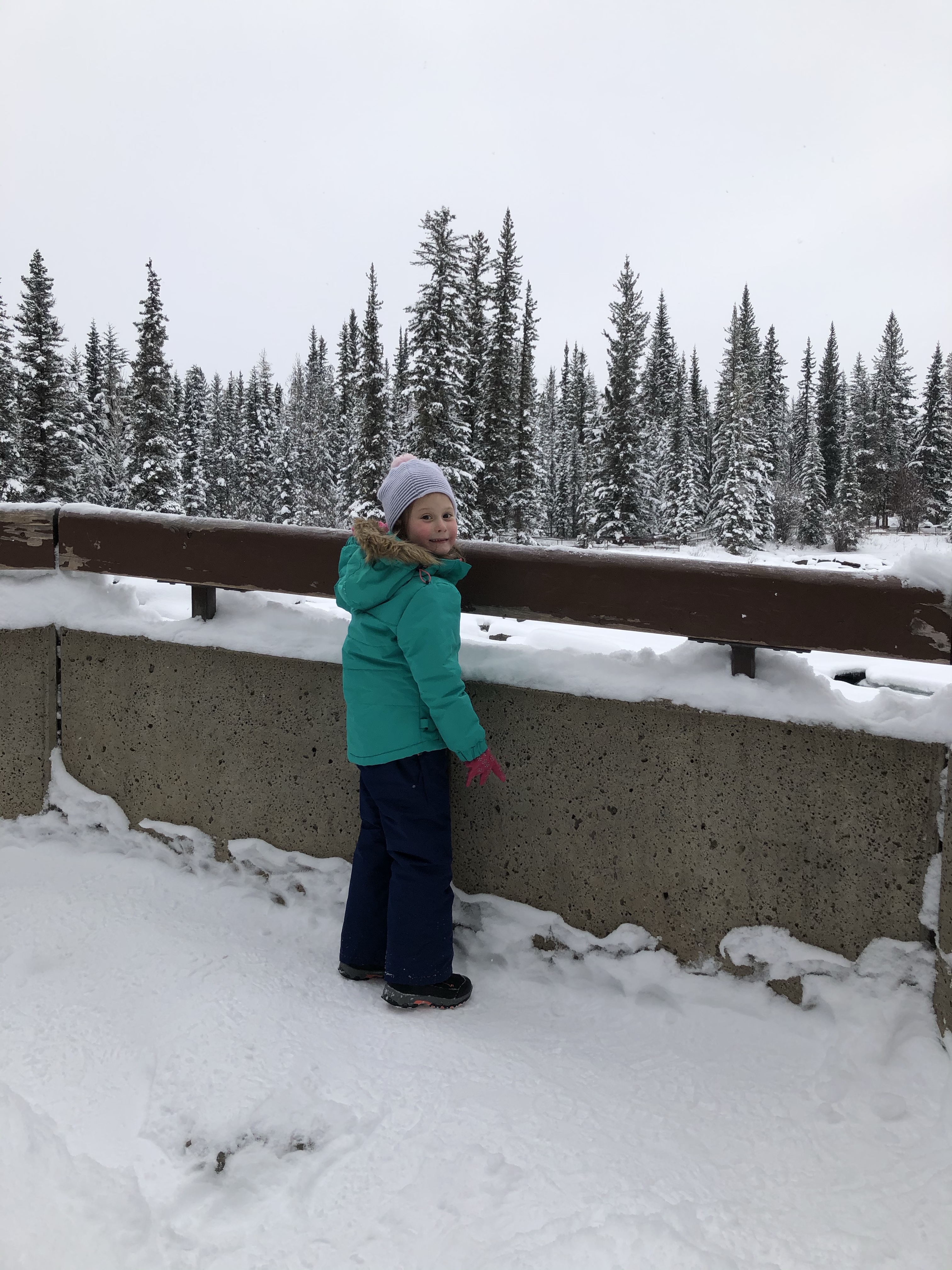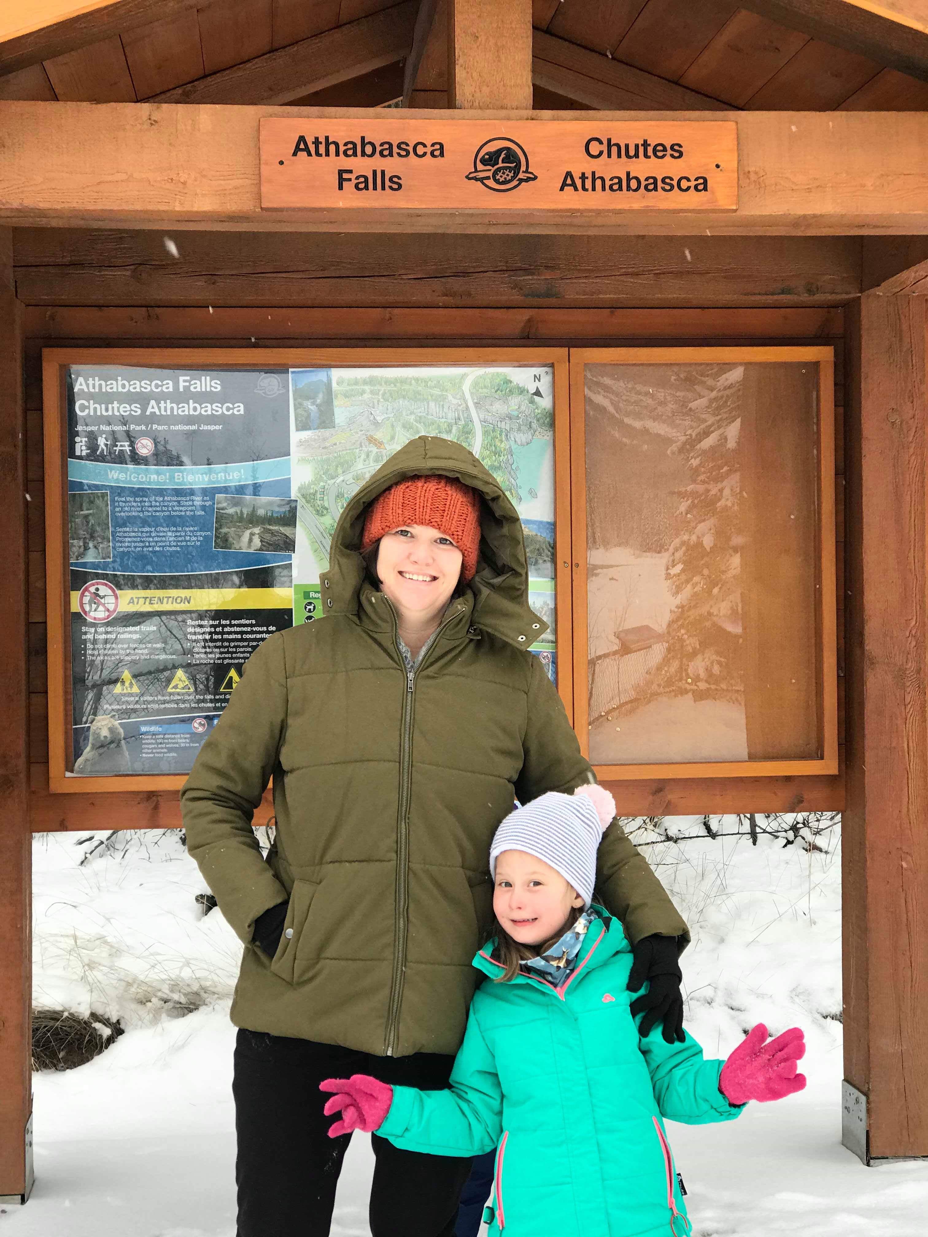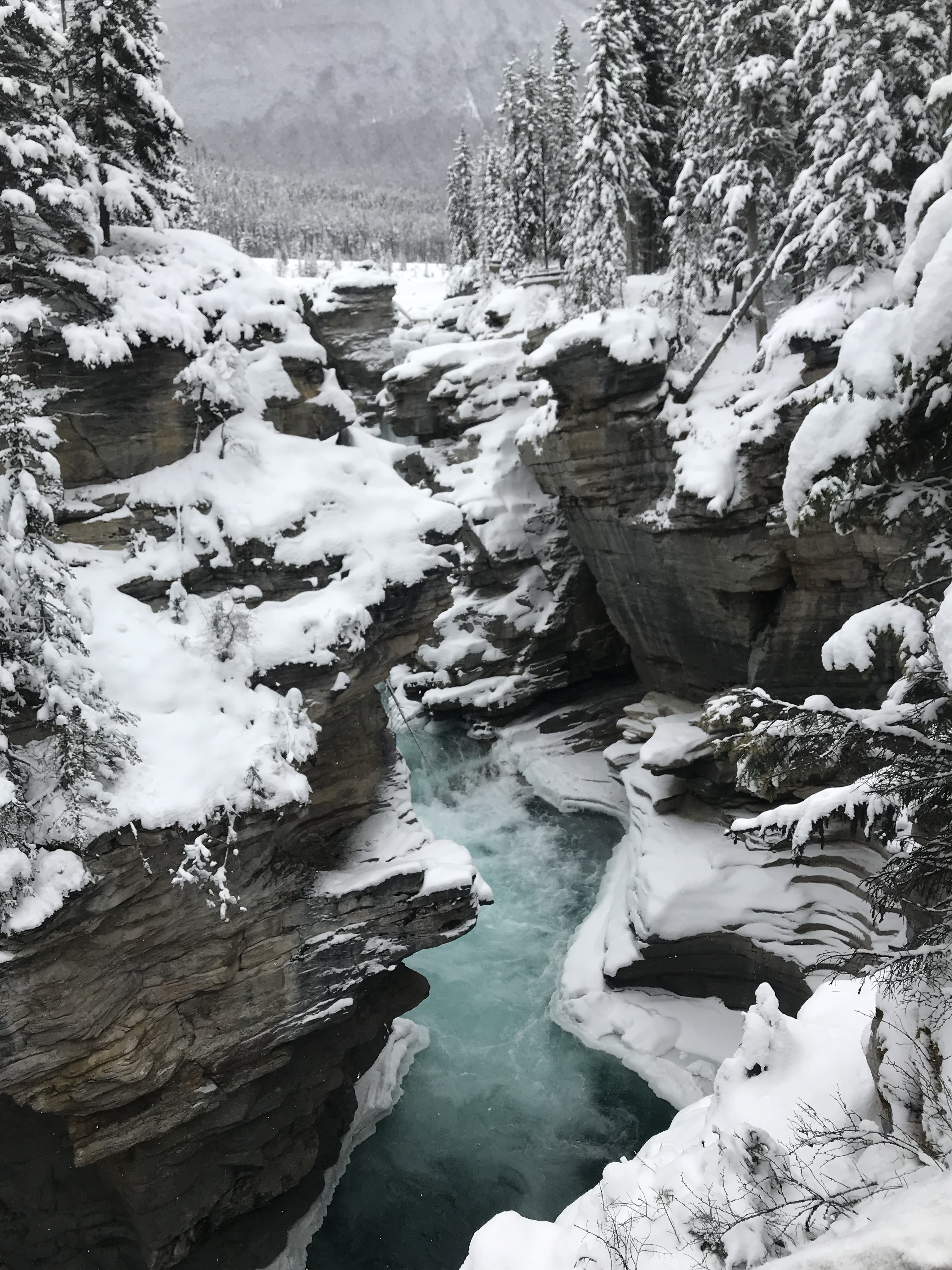 We stopped at Athabasca Falls about 30km from Jasper and quickly changed everyone into their ski pants. The snow was quite deep but the trudge in was well worth it. The turquoise icy water thundering over the falls was a sight and sound to behold.