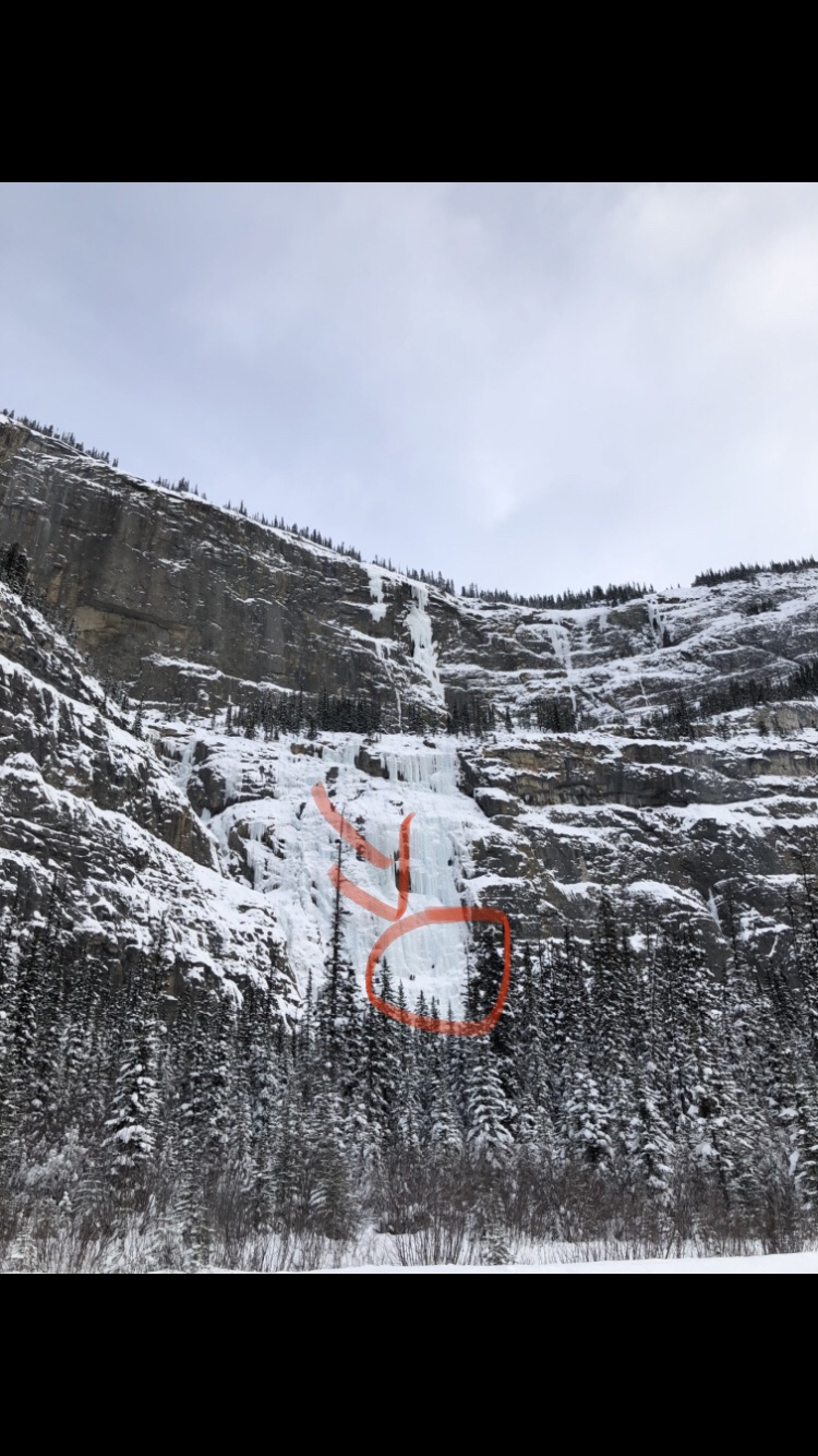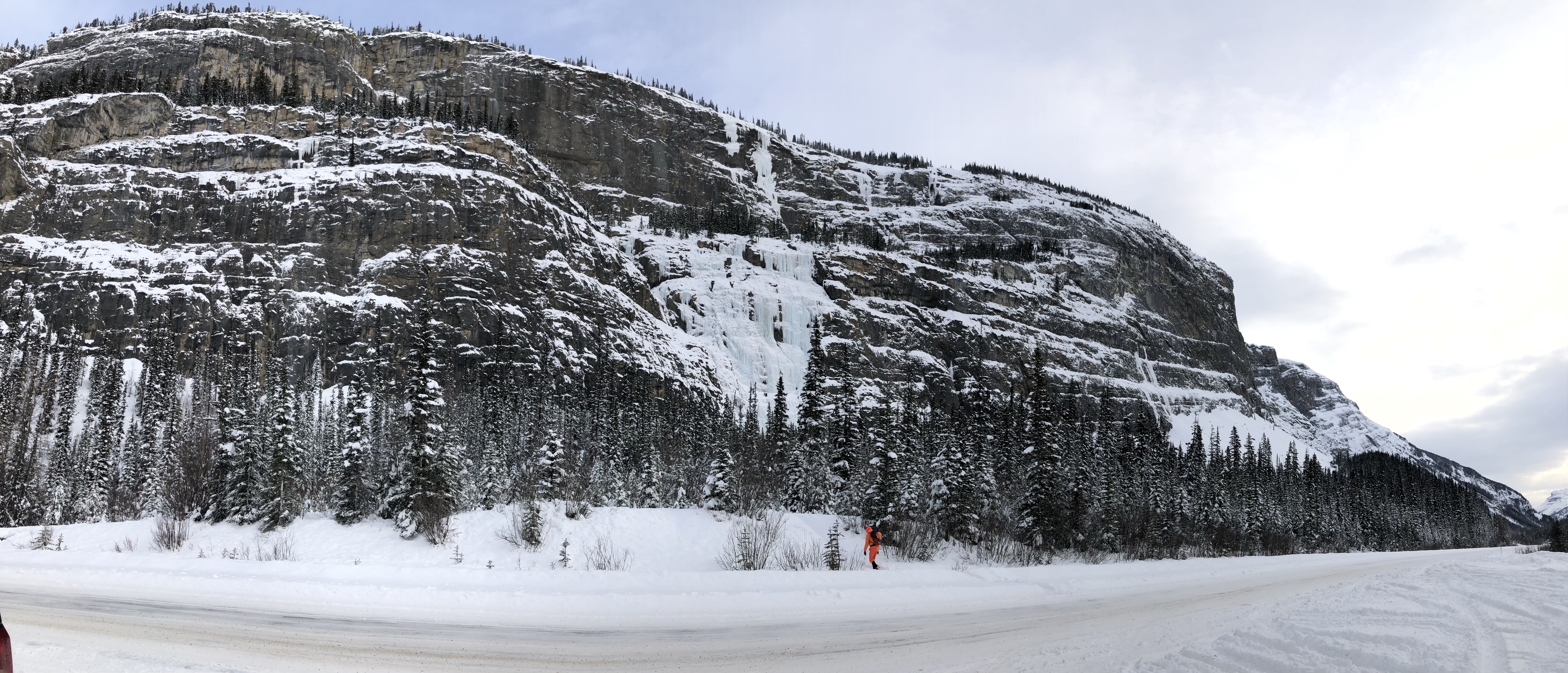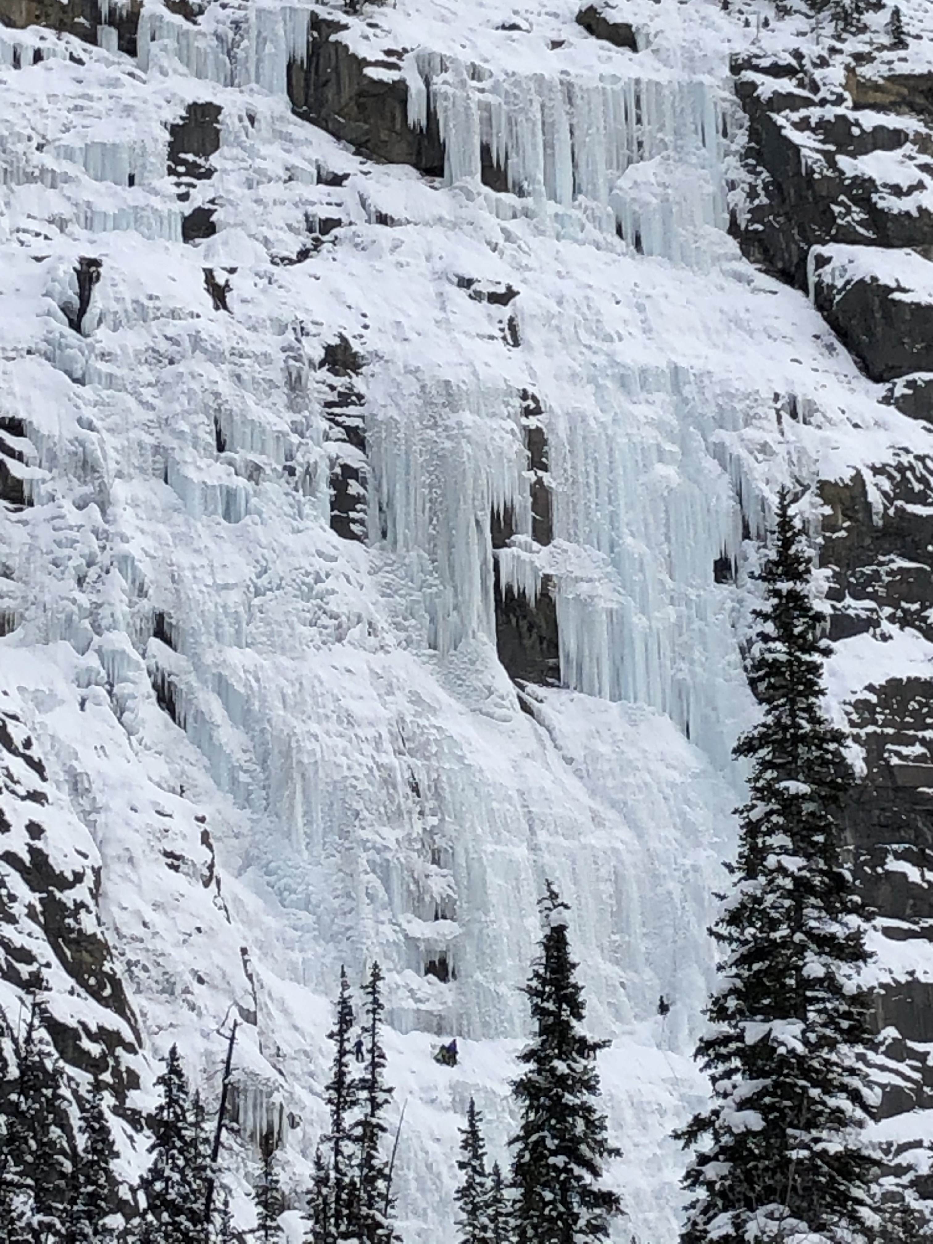 We hadn’t ventured too far when we started to notice random cars parked on the side of the road in the middle of nowhere…their drivers nowhere to be seen. The first couple we thought had maybe broken down but as we saw more and sometimes two or three parked together we wondered what was going on. About half way we stopped at a rest stop filled with more driverless cars parked, for a bathroom break when a vehicle pulled in, the occupants filing out, clipping ropes to their belts and fitting ice cleats to their boots. My curiosity got the better of me and I asked what they were up to. They pointed to the massive cliff across from us and squinting I could see ant sized people climbing an ice wall! They said it would take them about 5 hours to climb to the top and it wasn’t until we drove off that Ad and I wanted to know how long it would take them to come down!