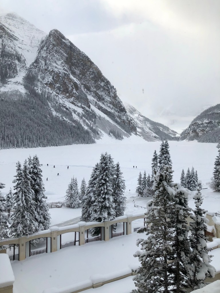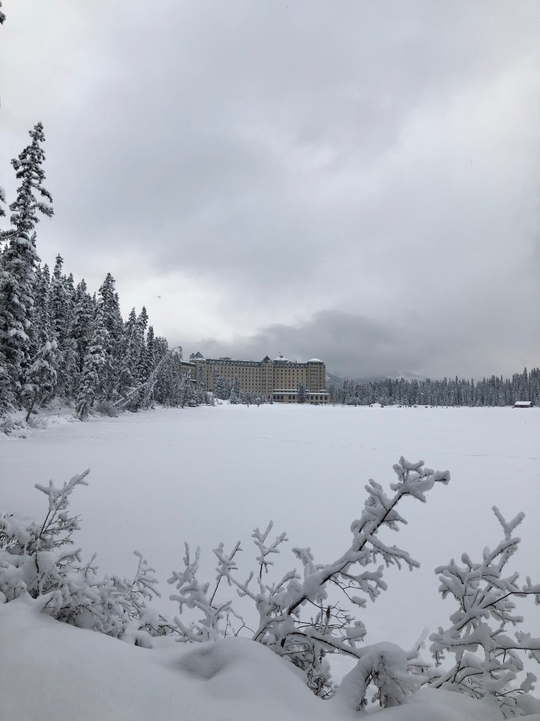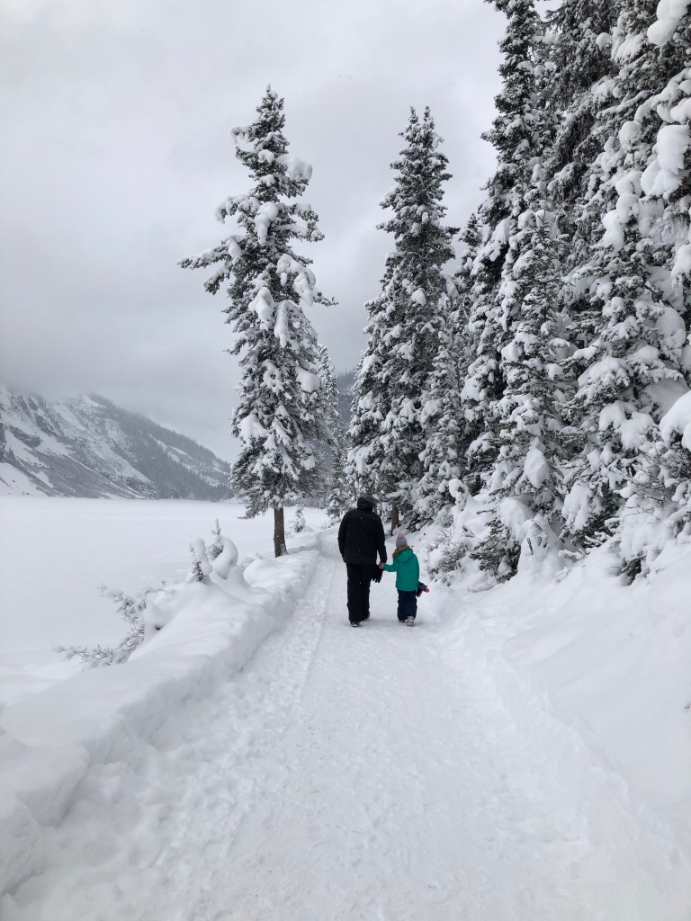 We spent the morning exploring the expansive hotel and shops before venturing out into the snow. The walk around the edge of the lake was amazing then returning over the lake itself was memorable, there’s something charming knowing that you’re walking on thick ice that is normally the most fabulous blue lake. After getting sufficiently cold Ad and the kids went back to our room to relax and warm up while Shan treated herself to a birthday boozy hot chocolate before her massage which was secretly organised as an early birthday surprise.